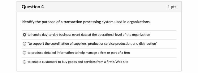 To handle day-to-day business event data at the operational level of the organization The purpose of an ________ is to support and integrate all facets of the business including planning manufacturing sales marketing and so on. Identify the purpose of a transaction processing system used in organizations. EnterpriseOne uses the following system functions for transaction processing. A to support the activities within a specific functional area of the firm XB to handle day-to-day business event data at the operational level of the organization C to support interaction between the firm and its. Identify the purpose of a transaction processing system used in organizations. To enable customers to buy goods and services from a firms Web site to support the activities within a specific functional area of the firm to support the coordination of suppliers product or service production and distribution to handle day-to-day business event data at the operational level of the organization. Transaction Processing Systems TPS serve the people in the operational level of an organization.